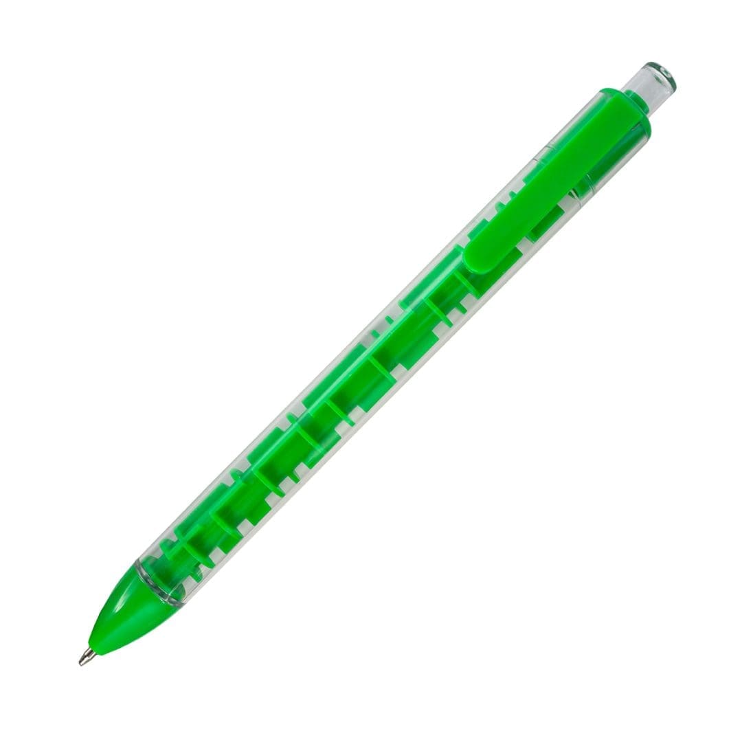 Oryginalny długopis z przezroczystym korpusem i wbudowanym labiryntem z dwiema metalowymi kulkami. Wkład w kolorze niebieskim.