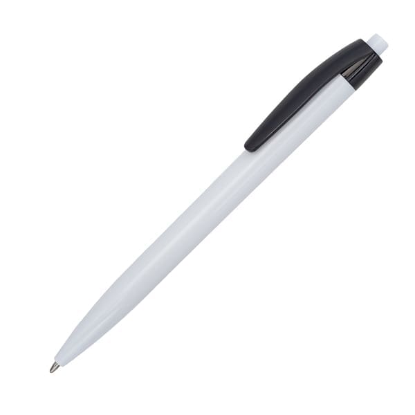 Plastikowy długopis wyposażony w niebieski wkład.