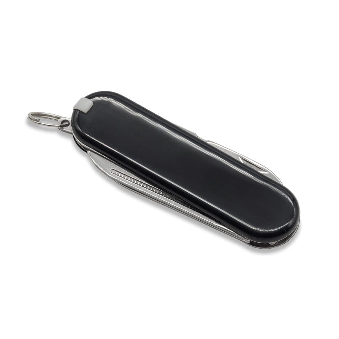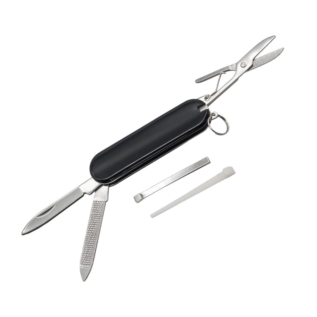 Kompaktowy scyzoryk wielofunkcyjny z ostrzem, pilnikiem, nożyczkami, pęsetą, wykałaczką i kółkiem do mocowania – idealny na co dzień i w podróży.