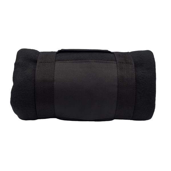 Czarny koc polarowy o gramaturze 180 g/m², obszyty maszynowo. Idealny do codziennego użytku oraz jako gadżet promocyjny.