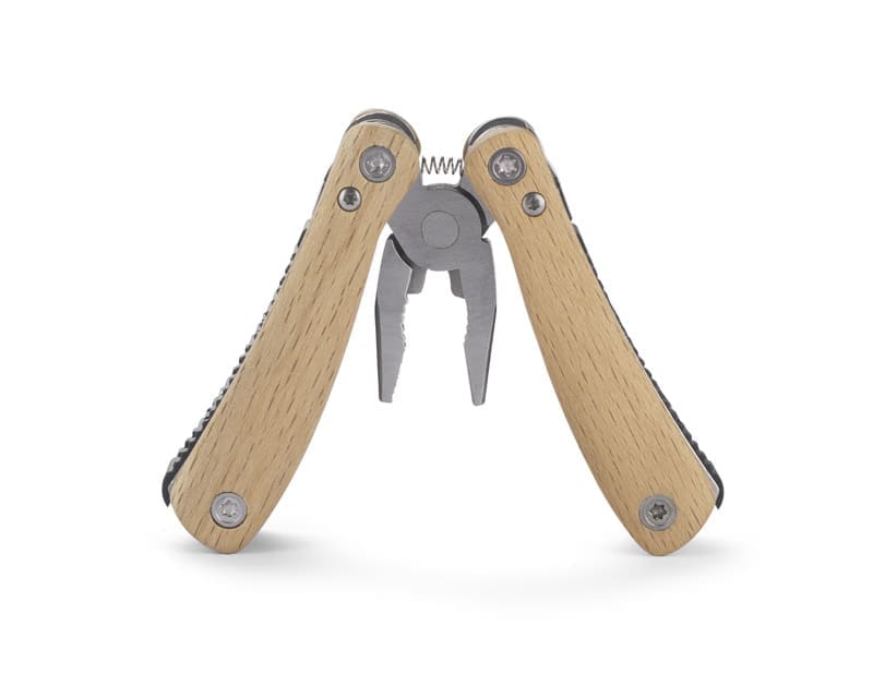 Narzędzie FORT to kieszonkowy gadżet z eleganckim drewnianym wykończeniem. Zawiera kombinerki, przecinak, nóż, śrubokręty (płaski i krzyżowy), pilnik, piłę oraz otwieracze do butelek i puszek. Do zestawu dołączony jest czarny, materiałowy pokrowiec.