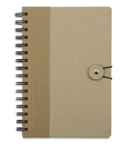 Ekologiczny notes A5 na spirali z praktycznym zamknięciem na gumkę. Zawiera 80 kartek w linie wykonanych z papieru po recyklingu. Uroku dodaje ozdobne wykończenie tekturą falistą. Logo nadrukujemy na okładce.