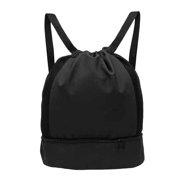 Pojemny plecak ze ściągaczem, wykonany z miękkiego PU. Posiada przegrodę na buty zapinaną na suwak, kieszonki boczne oraz szerokie paski.