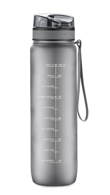 Bidon motywacyjny MOTIVA o pojemności 1000 ml pozwala na wygodne przechowywanie dużej ilości płynu. Na ściance znajduje się miarka motywacyjna w języku angielskim, która ułatwia monitorowanie ilości wypitej wody, czyniąc codzienne nawodnienie przyjemnością.