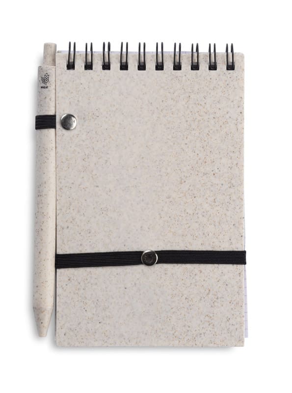 Notes TRESA z długopisem, kolorystyką dopasowanym do okładki. Długopis oraz okładka notesu wykonane są ze słomy pszenicznej. Notes na spirali, posiada 70 kartek w kratkę wykonanych z recyklingowanego papieru. Zamykany za pomocą gumki. Format A6. Wkład w długopisie w kolorze niebieskim.