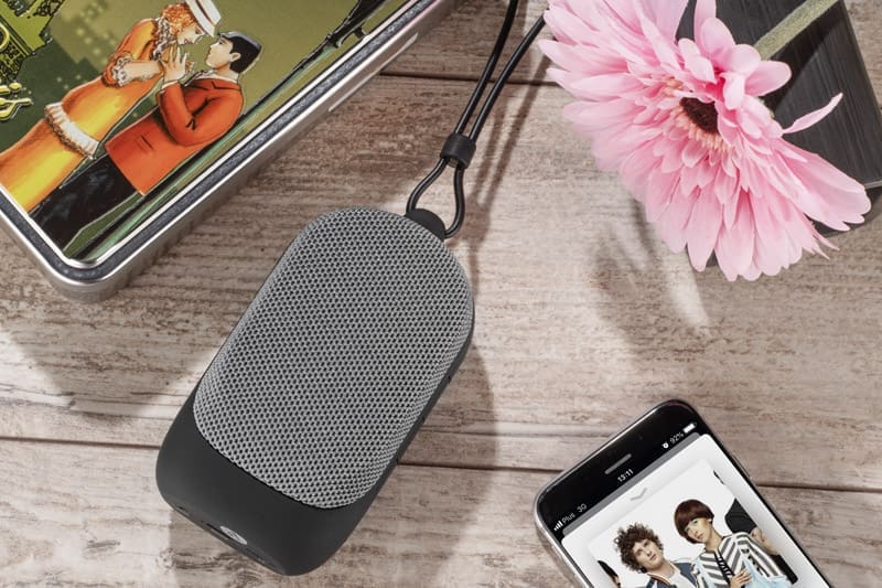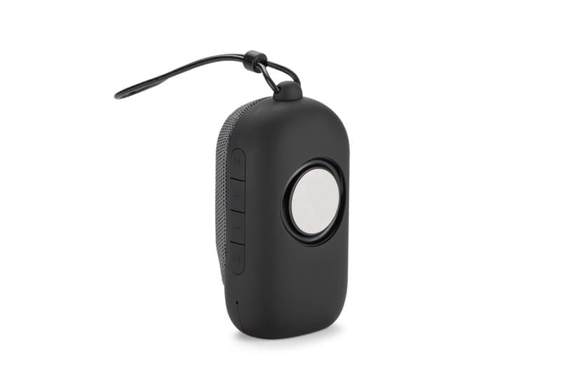 Głośnik bezprzewodowy CADENA zapewnia radość z ulubionej muzyki w każdym miejscu. Wyposażony w wygodny uchwyt, umożliwia łatwe przenoszenie lub zawieszenie.