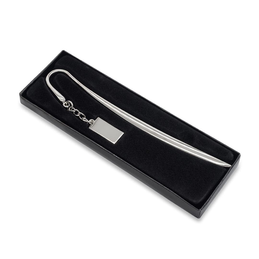 Metalowa zakładka do książki z zawieszką idealną do znakowania grawerem. Pakowana w czarne pudełko upominkowe.
