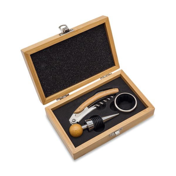 Elegancki zestaw akcesoriów do wina zawiera: korkociąg kelnerski z drewnianą rączką, wyposażony w otwieracz do butelek i nożyk do folii, zatyczkę do butelki oraz okapnik.