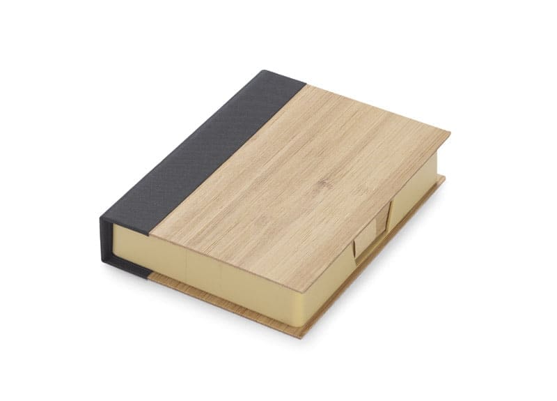 Zestaw karteczek na biurko w etui wykonanym z bambusa. Zestawienie znajdujące się w karteczkach do zapisków.