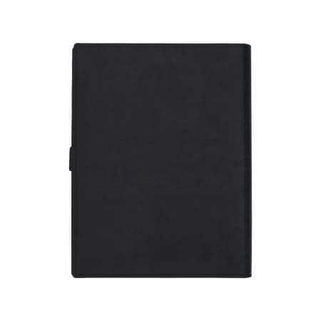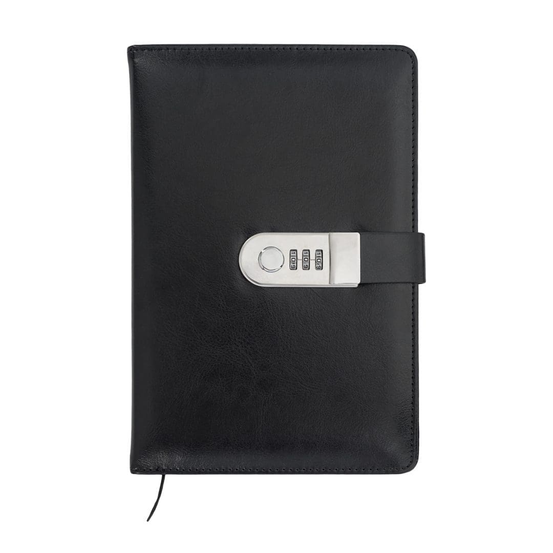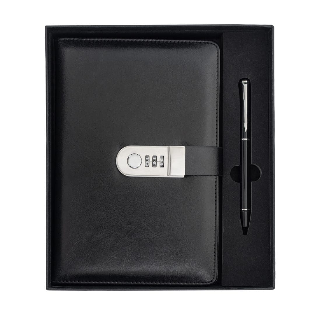 Elegancki czarny, 100 kartkowy notes w linie (80g/m2) w okładce z ekoskóry, wyposażony w zamek szyfrowy, w komplecie z długopisem. Wkład w kolorze niebieskim. Zapakowany w pudełko prezentowe.