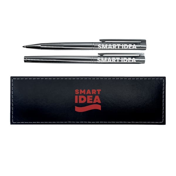 Zestaw piśmienniczy składający się z metalowego pióra kulkowego i długopisu. Wkład w kolorze niebieskim. Zapakowany w upominkowe opakowanie.