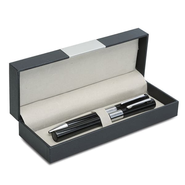 Zestaw składający się z metalowego długopisu i pióra kulkowego zapakowany w eleganckie etui o wypukłej fakturze. Oryginalny kształt klepsydry i połyskująca powierzchnia czynią z tego kompletu doskonały upominek reklamowy. Wkłady w kolorze niebieskim. Obrotowy mechanizm włączania.
