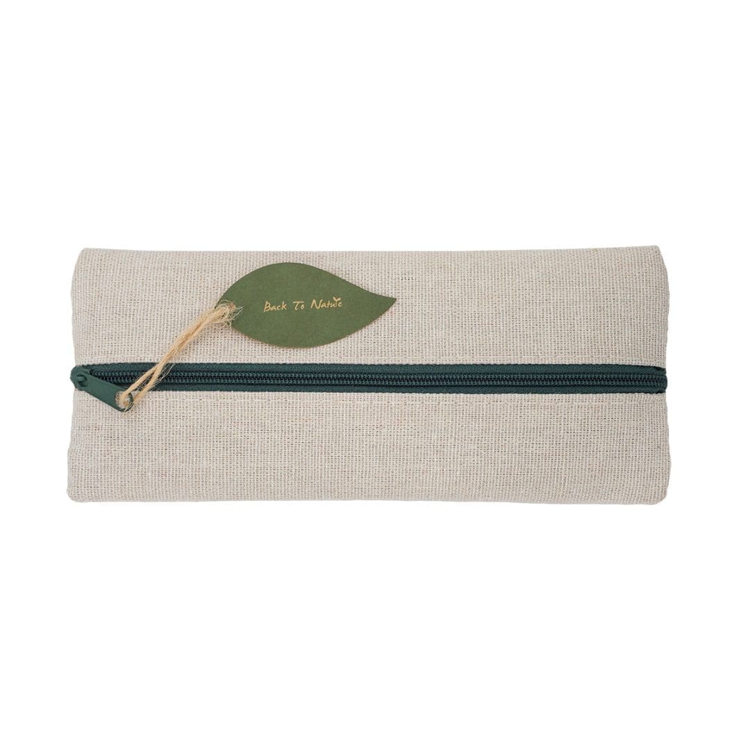 Zestaw artykułów piśmienniczych w jutowym piórniku zapinanym na zamek błyskawiczny. Zawiera: ołówek, długopis z niebieskim wkładem, linijkę (15 cm), gumkę oraz temperówkę. Produkty wykonano z naturalnych materiałów.
