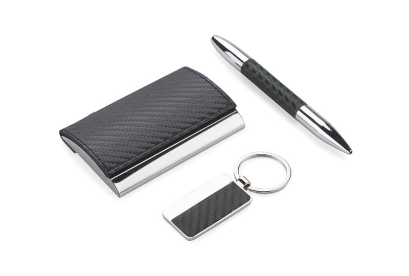 Elegancki zestaw upominkowy JOE składa się z wizytownika, breloka oraz długopisu, zapakowanych w czarne pudełko. Logo może być wygrawerowane na breloku lub nadrukowane na wizytowniku.