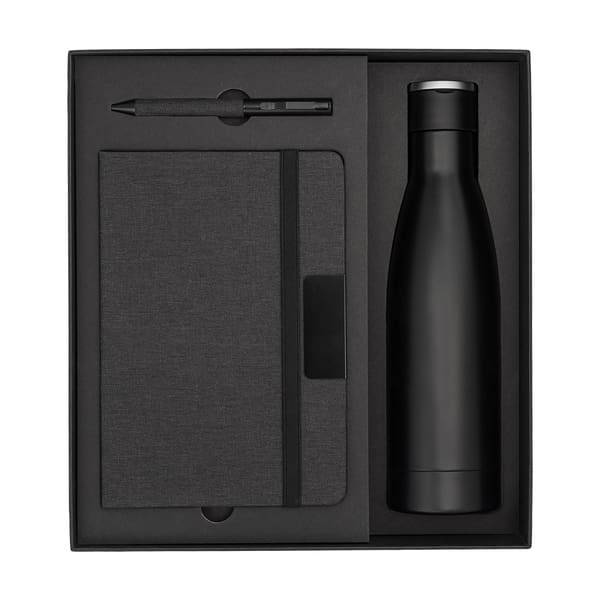 Biznesowy zestaw prezentowy składający się z butelki próżniowej, notesu i długopisu, zapakowanych w eleganckie, czarne pudełko. Butelka próżniowa ze stali nierdzewnej o pojemności 500 ml utrzymuje temperaturę powyżej 40°C do 15 godzin. Notatnik formatu A5 z okładką RPET, 80 kartek w kratkę, a długopis zdobiony tkaniną RPET z niebieskim wkładem.