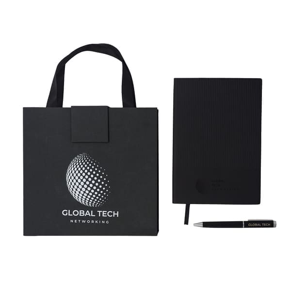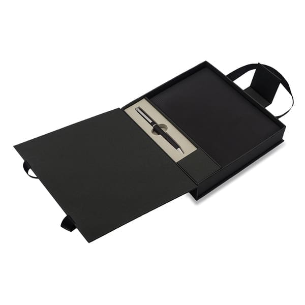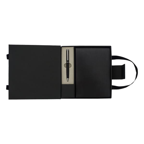 Elegancki zestaw upominkowy składający się z czarnego notesu i dopasowanego długopisu, idealny na prezent biznesowy lub osobisty.