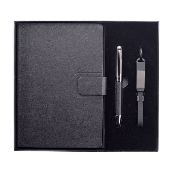 Czarny zestaw upominkowy z kablem USB 2w1 Davos to bezpieczny wybór dla firm, które stawiają na funkcjonalne gadżety reklamowe o wysokiej użyteczności. Produkt łączy w sobie estetykę, uniwersalność oraz realną wartość użytkową, co zwiększa szansę na długotrwałą ekspozycję marki.